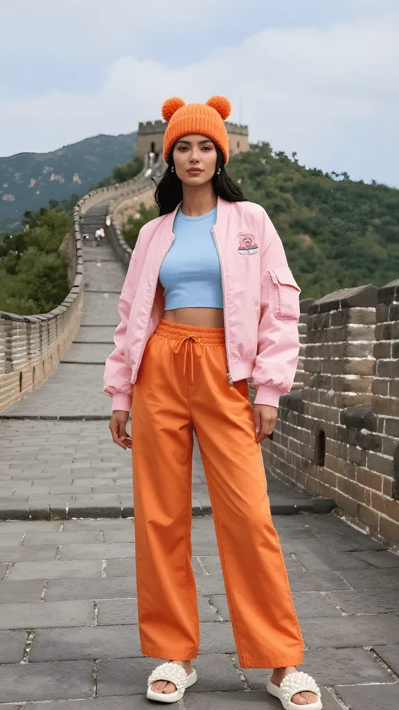 For the traveler who believes vacation is no time to blend in, this colorful combination brings maximum joy with minimal effort. A light pink bomber jacket over a light blue crop top paired with bright orange pants creates an outfit that’s impossible to ignore. The orange pom-pom beanie adds playful personality that screams adventure-ready.