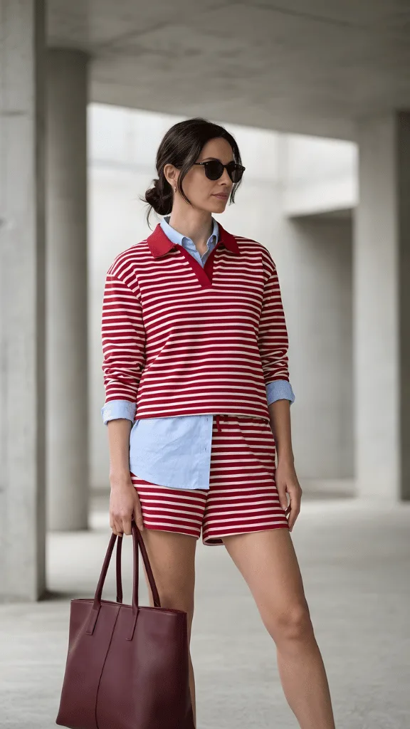Matching sets have emerged as one of the smartest travel investments, and this red and white striped version exemplifies why. The coordinated top and shorts create an instantly polished look, while the light blue oxford shirt layered underneath adds preppy sophistication. This is gingham sunshine spring vacation outfit adjacent styling with nautical flair.