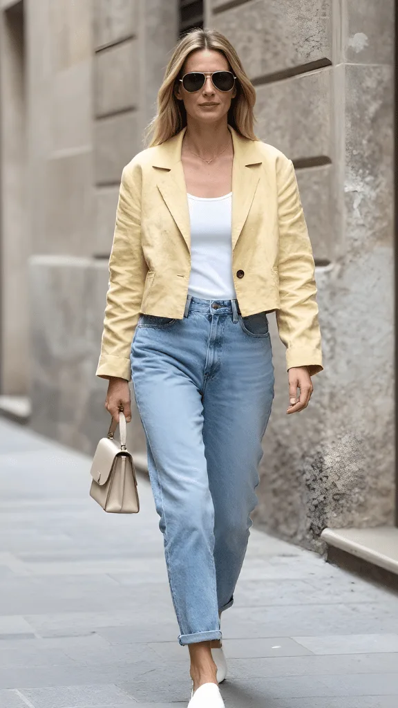There’s something undeniably Parisian about a cropped blazer worn open over a simple white tank. This butter yellow number brings warmth without weight, making it ideal for pastel spring vacation outfits europe and those in-between weather days when the sun plays hide and seek with the clouds. Paired with relaxed denim spring vacation outfits casual style, the look strikes that perfect balance between polished and laid-back.