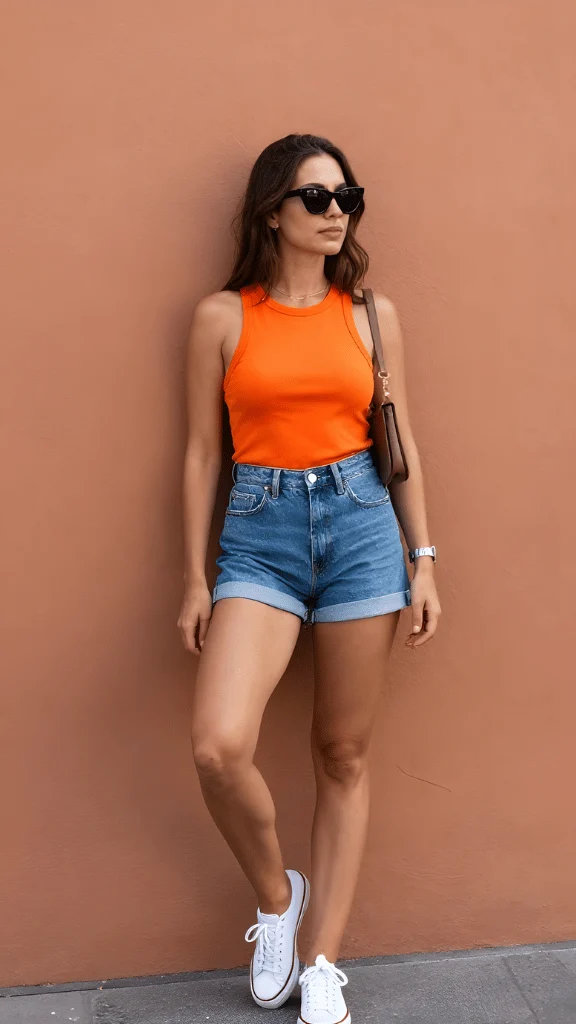 Vibrant Orange Tank with Classic Denim Shorts