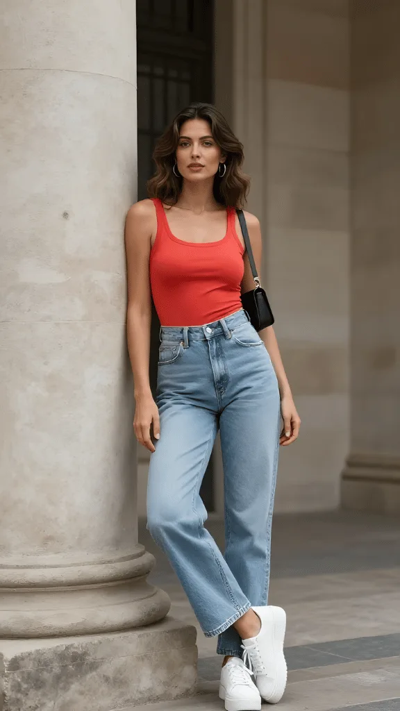 The silhouette here is all about balance. The fitted tank highlights the waist, while the relaxed straight-leg jeans provide that easy, unhurried vibe that vacation dressing should embody. White chunky sneakers ground the look in comfort, perfect for days filled with exploring new neighborhoods and stumbling upon hidden gems.