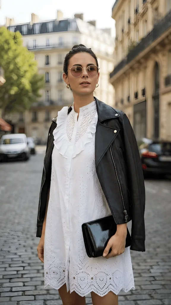 White Eyelet Dress with Black Leather Jacket