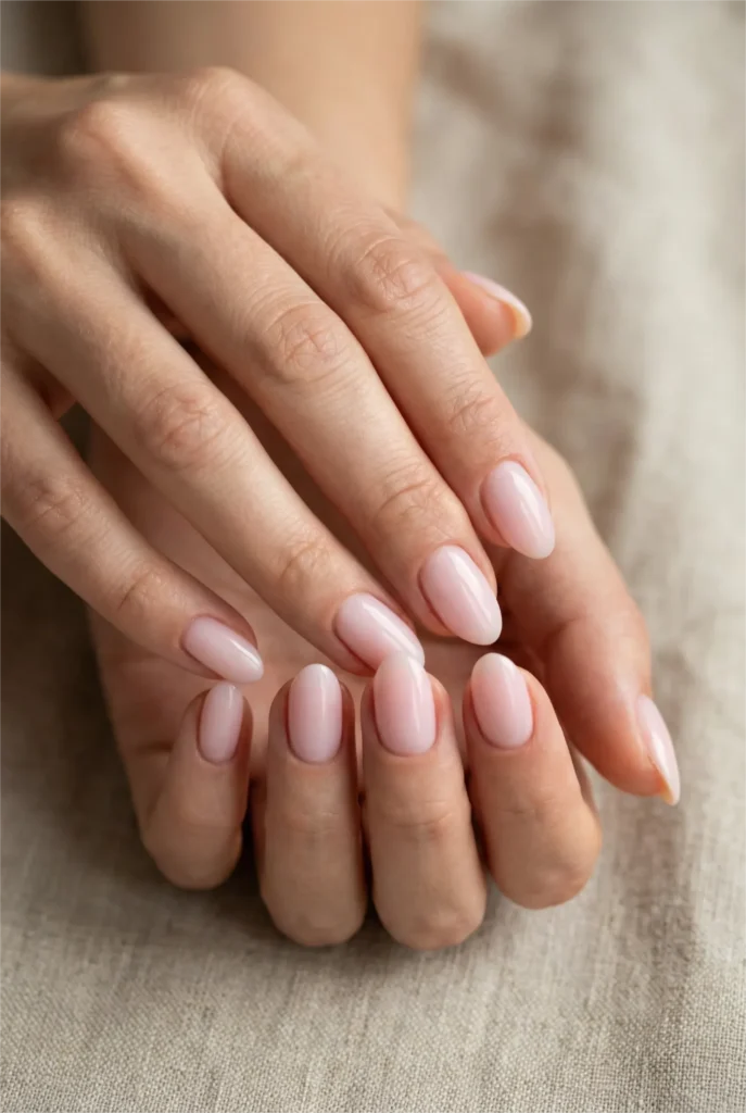 This barely-there blush pink captures the essence of soft pastel nails with its delicate, natural-looking hue that enhances rather than masks the nail. The almond shape creates an elegant, feminine silhouette that flatters all hand types and finger lengths. This particular shade of pink contains subtle peach undertones that add warmth and prevent the color from appearing too cool or artificial, making it one of the most universally flattering minimalist simple nails 2026 options.