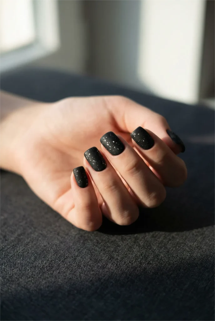 The scattered gold glitter particles create a constellation effect across the black base, offering visual interest without overwhelming the overall minimalist aesthetic. This technique allows the nails to transition from understated elegance during the day to subtle glamour in evening lighting. The square minimalist nails shape keeps the look grounded and practical, making this design suitable for those who use their hands frequently but don’t want to sacrifice style.