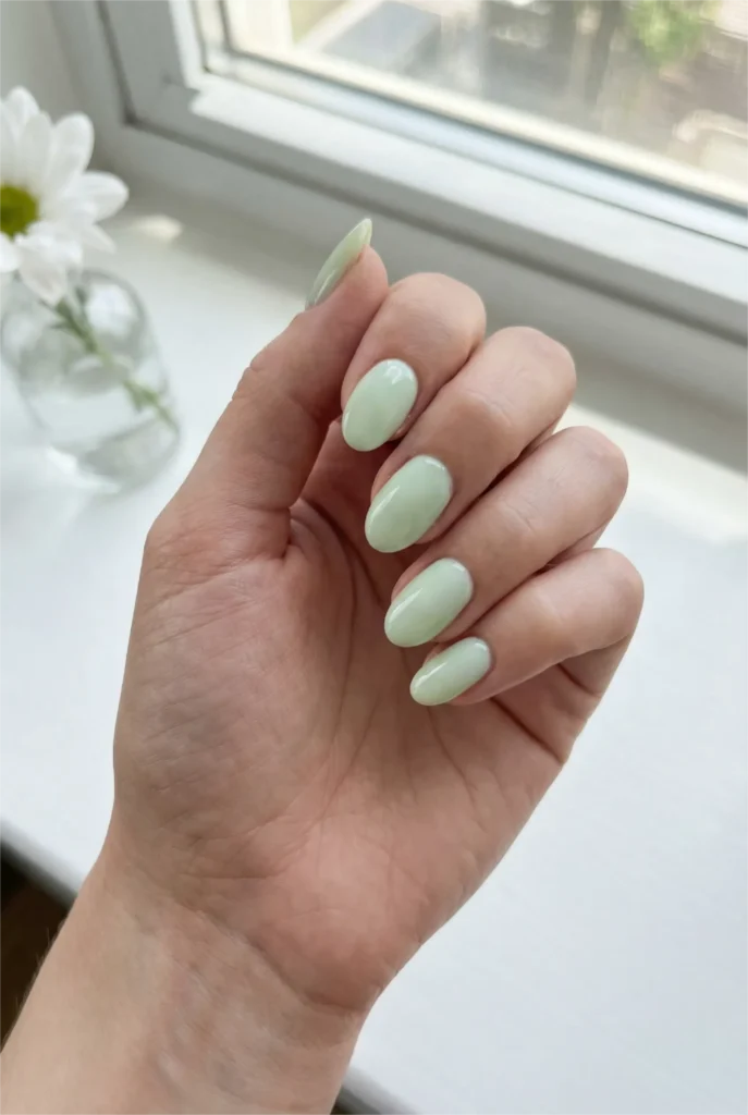 This refreshing mint green brings a playful energy to minimalist simple nails 2026 with its cool, revitalizing hue. The short-to-medium oval shape provides a practical yet polished foundation that works beautifully for the clean girl nails aesthetic. This particular shade of mint contains subtle blue undertones that prevent it from appearing too yellow or lime-toned, instead offering a fresh, cooling color reminiscent of spring mornings and seaside breezes.