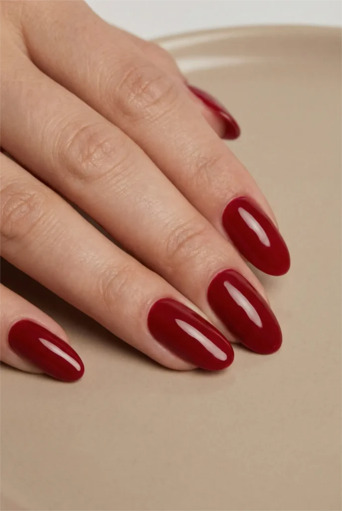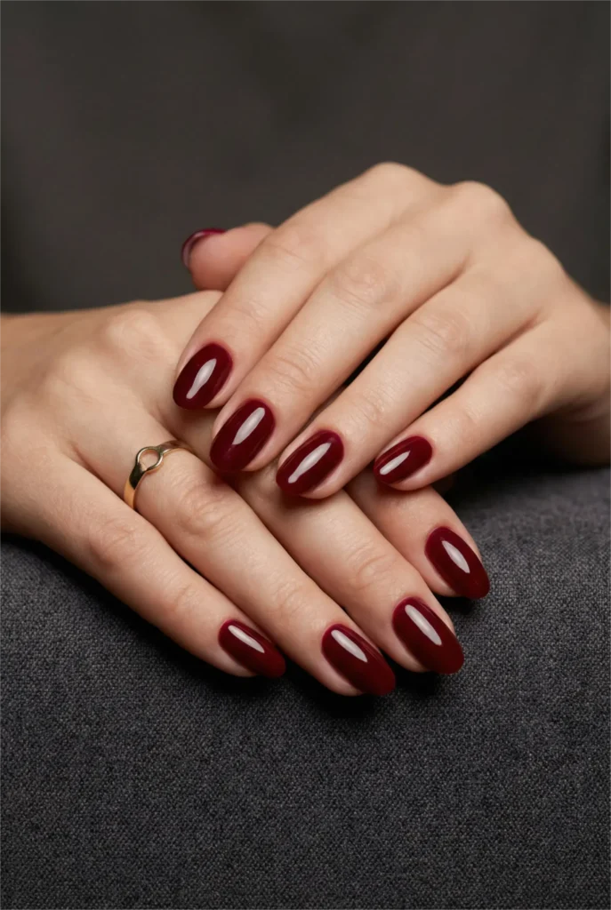 Deep burgundy brings timeless sophistication to this stunning example of red minimalist nails that feels both classic and contemporary. The wine-toned shade offers a more subdued alternative to bright reds while maintaining the power and elegance associated with red manicures. The medium oval shape creates a universally flattering silhouette that elongates fingers without the drama of stiletto or extreme almond shapes, making this one of the most accessible minimalist nails 2026 designs.
