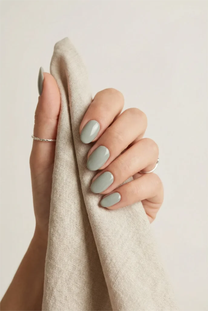 The subtle gray-green undertones in this polish create a sophisticated, earthy aesthetic that pairs beautifully with natural fabrics, minimalist jewelry, and neutral wardrobes. The glossy finish catches light gently, adding dimension without excessive shine or sparkle. This particular shade of sage feels incredibly modern and fresh, perfectly aligned with current interior design and fashion trends that celebrate organic, nature-inspired color palettes.