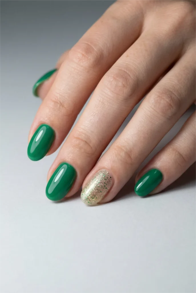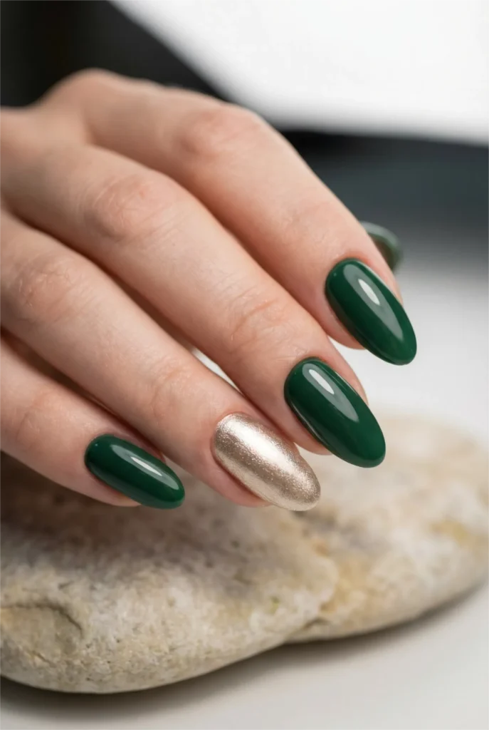 This stunning combination of deep forest green minimalist nails with a single golden shimmer accent nail creates the perfect balance between earthy sophistication and luxurious detail. The rich emerald-toned green polish offers a refined alternative to traditional neutrals while maintaining the clean aesthetic that defines minimalist nail designs. The oval nail shape provides a soft, feminine silhouette that complements the bold color choice without appearing too dramatic.