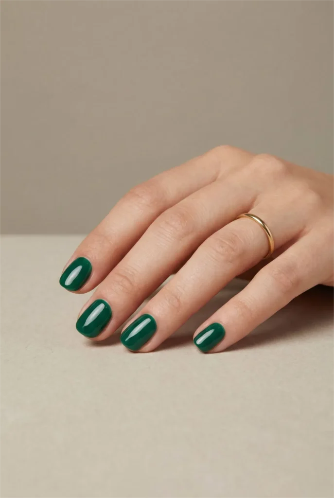 This deep forest green showcases the beauty of earthy tones in minimalist simple nails 2026 with its rich, natural hue. The short square shape provides a modern, geometric foundation that feels particularly contemporary and fashion-forward. This particular shade of green contains subtle brown undertones that prevent it from appearing too bright or artificial, instead offering a grounded, nature-inspired color that feels sophisticated and mature.