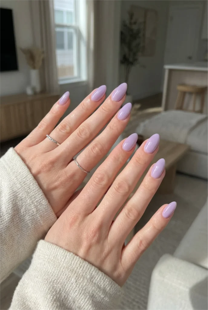 The glossy finish enhances the creamy texture of the polish, creating a mirror-like reflection that adds dimension to the simple nail design. The neutral undertones in this lavender shade make it surprisingly versatile, complementing a wide range of skin tones and wardrobe choices. This color works particularly well for spring and summer nails 2026, though its muted quality allows it to transition seamlessly into cooler months when paired with cozy textures and neutral tones.