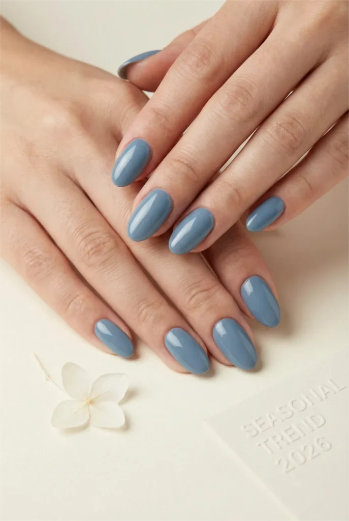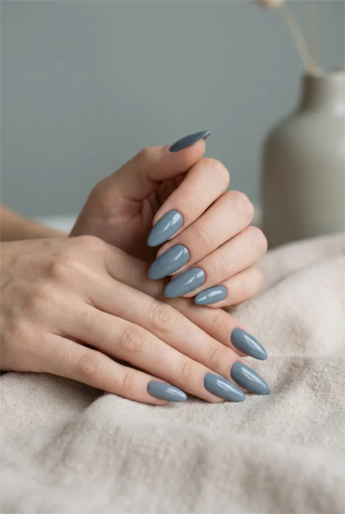 These almond minimalist nails demonstrate the versatility of cool-toned colors in creating clean girl nails aesthetics. The dusty blue pairs beautifully with silver jewelry, denim, and neutral wardrobes, offering surprising versatility for such a distinctive shade. This nail inspiration works particularly well for spring and early summer when lighter, cooler tones dominate fashion trends. The simple nail design proves that minimalist nails 2026 can incorporate unique colors while maintaining the refined, uncluttered appearance that defines the aesthetic.