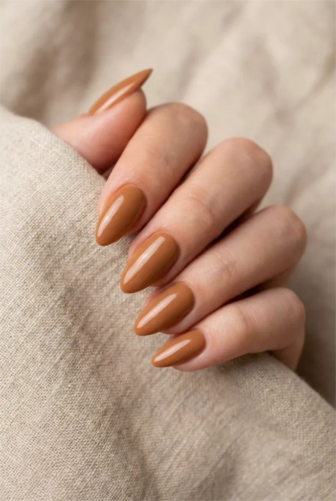 This luxurious caramel brown showcases the beauty of warm, neutral tones in minimalist nails 2026. The almond shape creates an elegant, elongating silhouette that flatters all hand types. This particular shade of caramel contains golden undertones that prevent it from appearing too cool or muddy, instead offering a rich, warm tone reminiscent of melted caramel or sun-kissed skin.