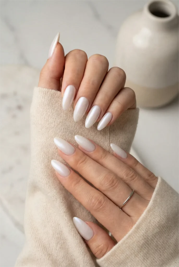 The pearlescent quality of the shimmer creates a sophisticated glow that changes subtly in different lighting conditions, offering versatility throughout the day. This simple nail design works exceptionally well for bridal manicures, spring celebrations, and summer nails 2026 when lighter, brighter colors dominate fashion trends. The creamy white base prevents the shimmer from appearing too frosty or juvenile, maintaining an elegant, refined appearance that suits mature tastes.