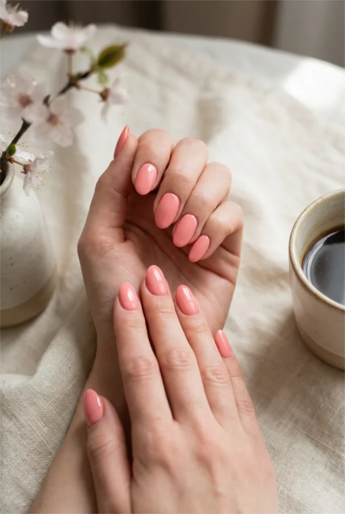This beautiful warm coral pink brings cheerful energy to soft pastel nails with its peachy-pink hue. The short-to-medium oval shape provides a classic, wearable foundation that works beautifully for everyday life. This particular shade of coral contains both pink and orange undertones that create a warm, flattering tone that complements a wide range of skin tones, particularly those with warm or neutral undertones.