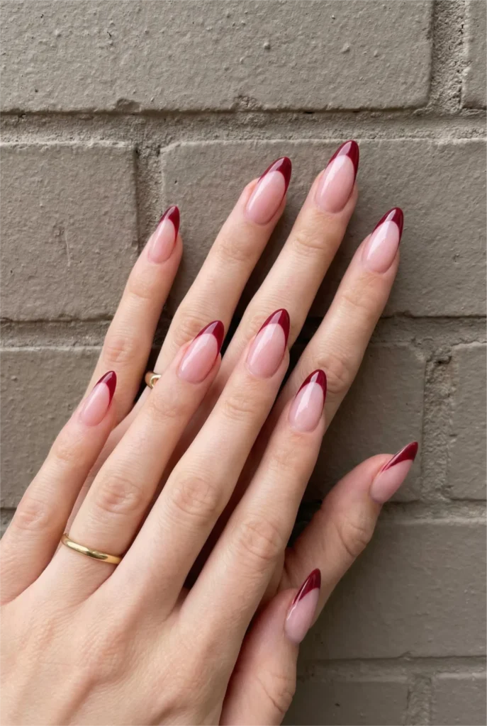 This innovative twist on classic French nails features burgundy tips instead of traditional white, creating a sophisticated take on red minimalist nails. The elongated almond shape provides an elegant canvas for the diagonal French design that adds visual interest through its asymmetrical approach. This modern interpretation demonstrates how trendy nails 2026 can honor classic techniques while introducing contemporary elements that feel fresh and fashion-forward.