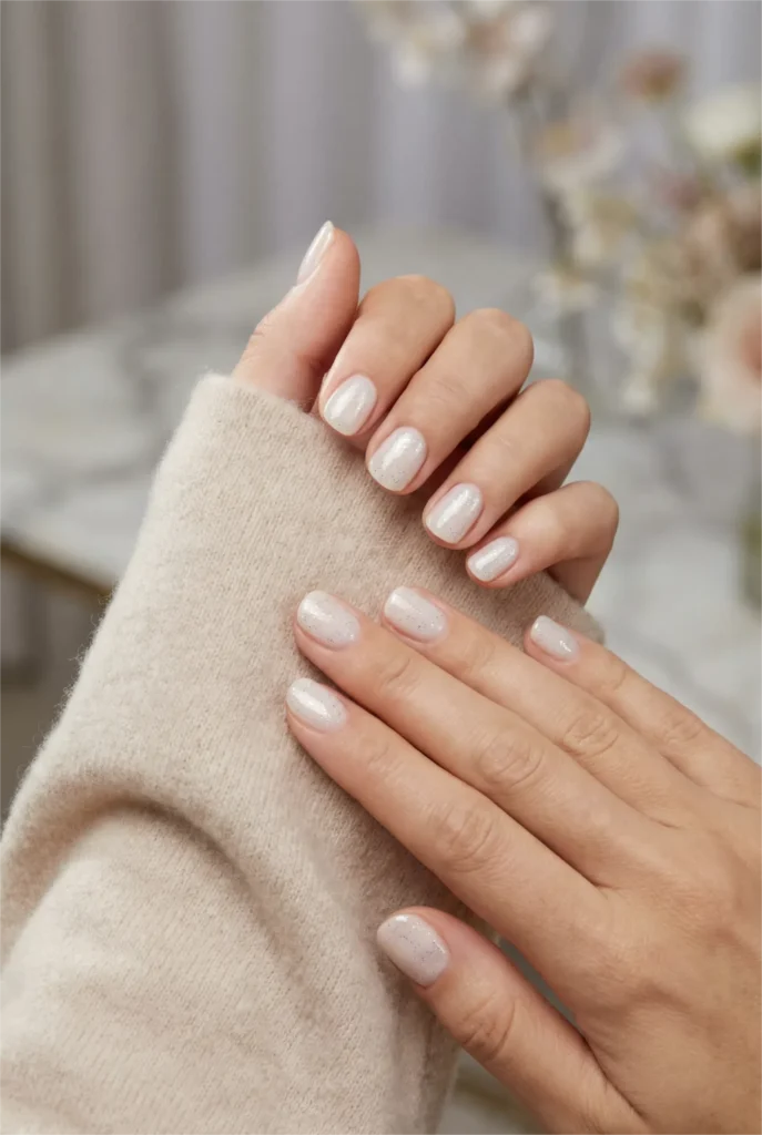 These short simple nails demonstrate how texture can add interest to minimalist nail designs without requiring length or dramatic shapes. The slightly rounded square tips provide durability while maintaining a soft, feminine aesthetic. This nail inspiration is particularly valuable for those with active lifestyles who need practical nail lengths but refuse to sacrifice style. The milky shimmer finish offers just enough personality to keep the look interesting while remaining appropriate for virtually any setting or occasion.