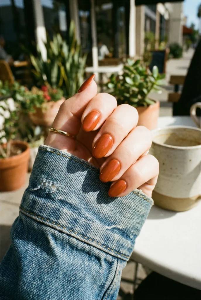 This stunning terracotta orange brings warmth and vitality to minimalist simple nails 2026 with its earthy, sun-baked hue. The medium oval shape provides a balanced, wearable foundation that complements the bold color choice without appearing too dramatic. This particular shade of orange contains brown undertones that prevent it from appearing neon or juvenile, instead offering a sophisticated, clay-inspired tone that feels grounded and natural.