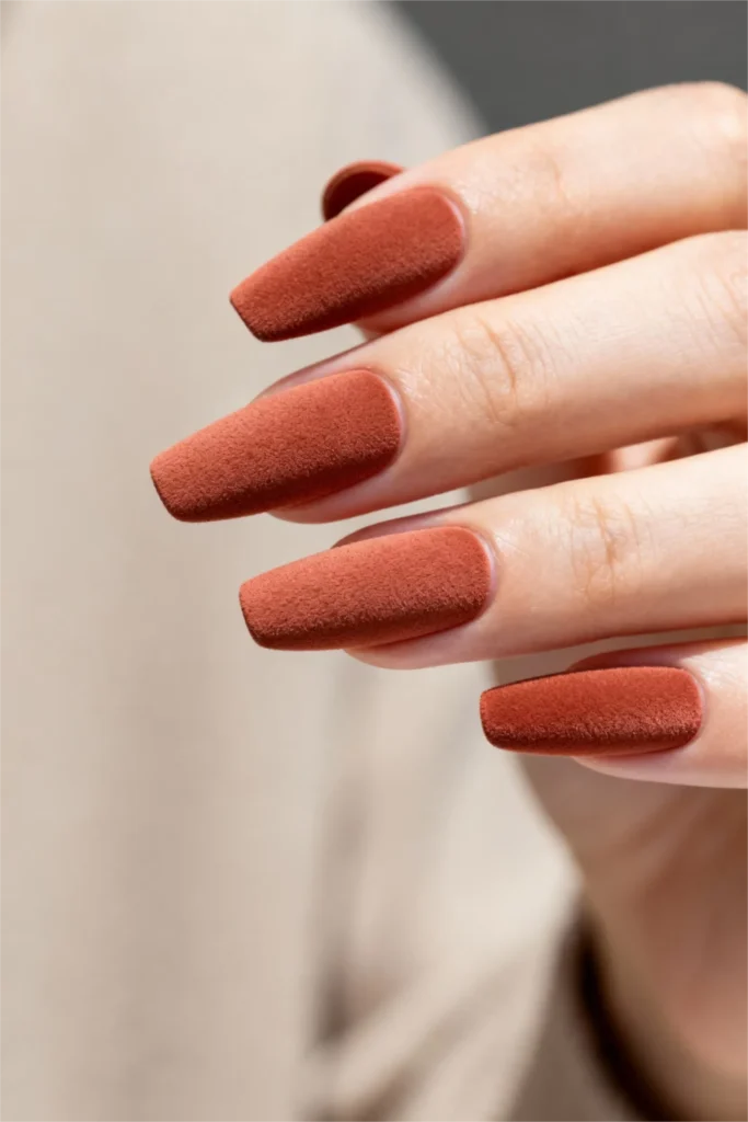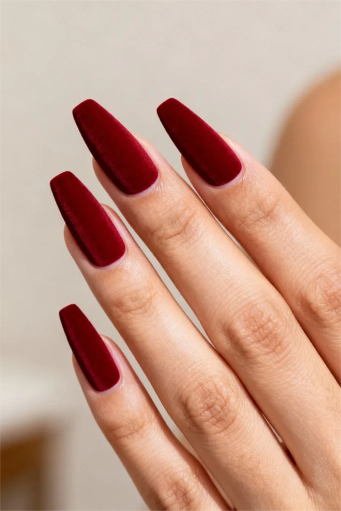 This falls perfectly into fall coffin nails ideas and winter holiday manicures, offering a festive yet sophisticated alternative to traditional glossy reds. The velvet finish pairs beautifully with seasonal textures like wool, cashmere, and suede, creating a cohesive, luxurious aesthetic. It’s also incredibly flattering in photographs, making it a popular choice for special occasions, holiday parties, or any time you want your nails to be the statement accessory.
