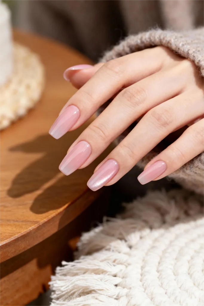 Delicate pink ombré creates a romantic, dimensional effect that elevates simple pink coffin nails into something truly special. The gradient transitions from a deeper rose at the base to a lighter, nearly translucent pink at the tips, creating natural depth and visual interest. The subtle pearlescent shimmer throughout adds a luminous quality that catches light beautifully without reading as overly glittery.