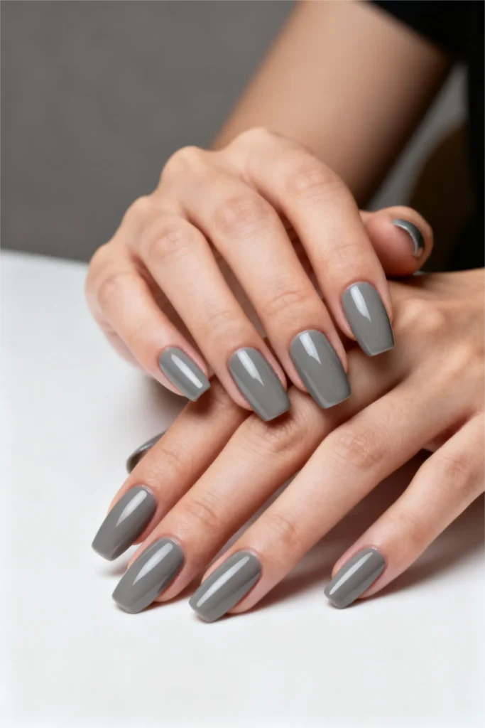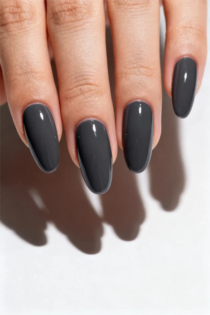 Sophisticated charcoal gray brings modern edge to medium coffin nails designs, offering a contemporary alternative to traditional black that feels softer yet equally impactful. This particular shade captures that perfect slate-gray tone—not quite black, not quite silver, but a balanced neutral that works across seasons and styles. The glossy finish adds depth and dimension, preventing the gray from appearing dull or lifeless.