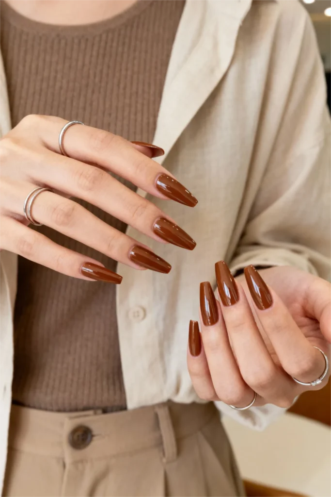 These long coffin nails designs showcase how length amplifies the elegance of warmer neutral tones. The caramel shade elongates the fingers naturally, while the coffin shape’s tapered silhouette adds refined structure. This falls perfectly into the brown coffin nails and chocolate brown nails categories while leaning lighter and more golden than deeper espresso shades.