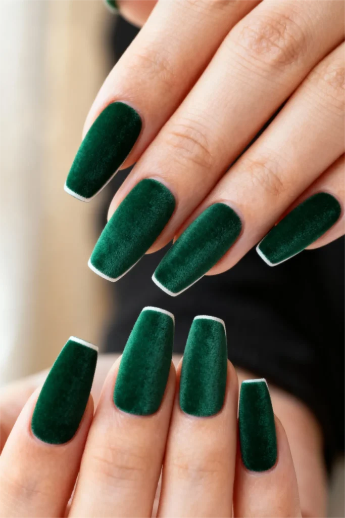 These trendy coffin nails designs work beautifully as fall coffin nails ideas and winter manicures, especially during the holiday season when rich textures and jewel tones dominate fashion. The forest green pairs perfectly with burgundy, gold, and cream for seasonal styling, or stands alone as a bold everyday statement. The velvet finish also tends to wear more gracefully than standard polish, maintaining its luxurious appearance longer.