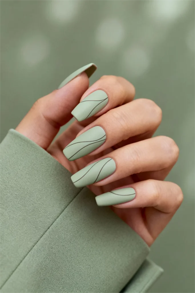 Soft sage green creates a serene backdrop for delicate line art in this elevated take on simple coffin nails designs. The muted, pastel green feels fresh and calming, while the thin black lines add just enough visual interest to elevate the look beyond basic color. This demonstrates how minimalist nail art can enhance rather than overwhelm the coffin nail shape.