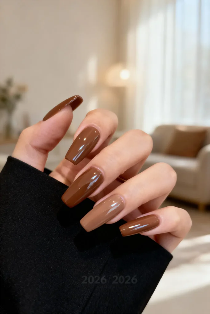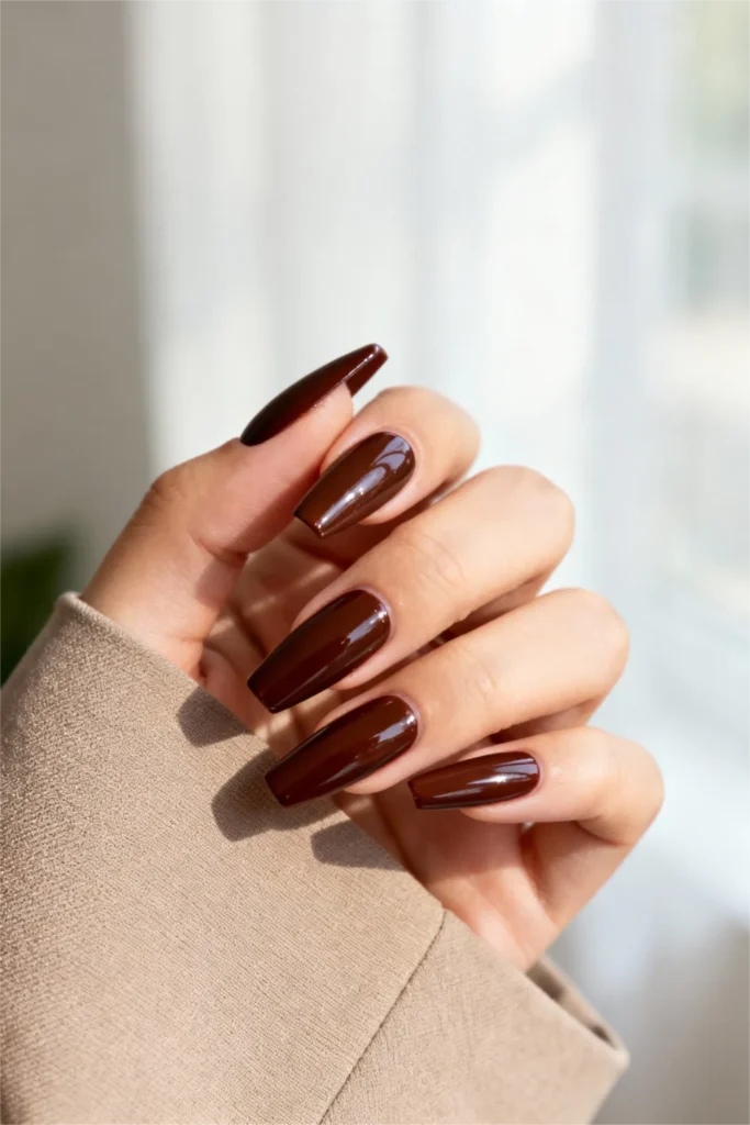 These brown coffin nails and chocolate brown nails showcase how the darkest neutral shades can carry as much impact as bold colors while maintaining greater versatility. The glossy finish creates a wet-look shine that feels modern and expensive, elevating the simple single-color application. This falls beautifully into fall coffin nails ideas and winter manicures, complementing the deeper, moodier color palettes that dominate cooler months.