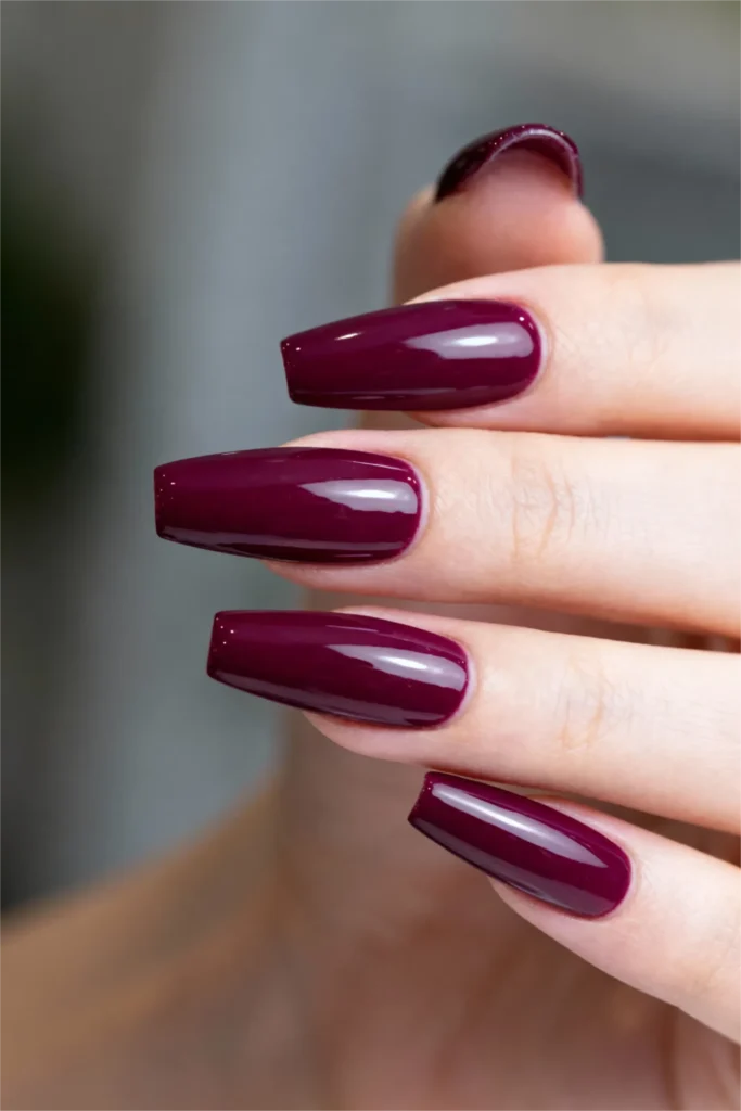 Long coffin nails designs like this one command attention without requiring intricate nail art or embellishments. The length itself becomes the statement, while the jewel-toned burgundy adds richness and elegance. This color choice works particularly well for fall coffin nails ideas and winter occasions, complementing cozy knits, leather jackets, and the darker color palettes that dominate cooler months.