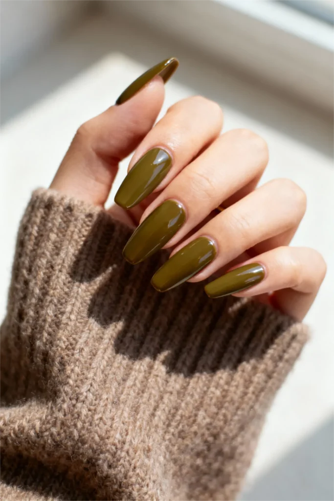 Olive green brings an earthy, grounded elegance to coffin nails designs 2026, offering a sophisticated alternative to brighter greens or traditional neutrals. This particular shade walks the line between brown and green, creating a versatile color that complements both warm and cool-toned wardrobes. The glossy finish keeps the muted tone from appearing dull, adding dimension and luminosity.