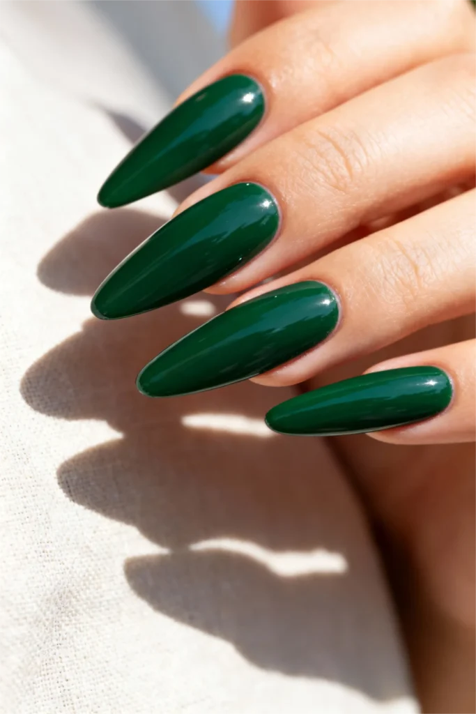 Style this bold choice with gold jewelry for maximum drama, or keep accessories minimal to let the nails serve as your statement piece. The emerald green pairs beautifully with neutral outfits—think black, white, cream, or camel—allowing the color to truly pop. This is the perfect design when you want something undeniably eye-catching that still maintains elegance and wearability.