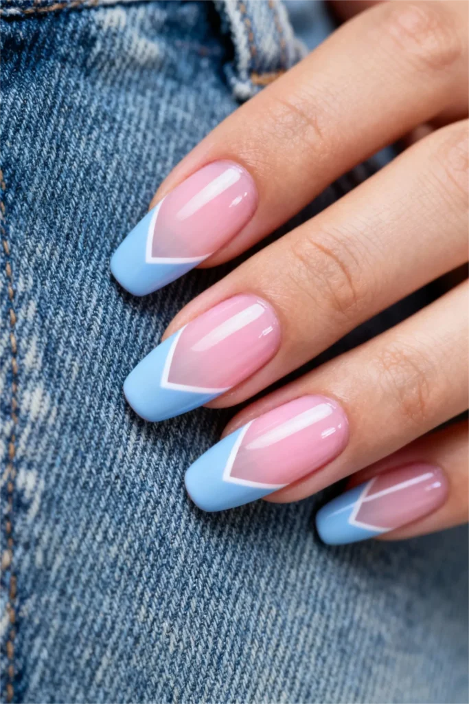 Innovative French tip coffin nails get a fresh update with geometric color-blocking in soft pastels. This design reimagines the classic French manicure by replacing traditional white tips with a creative combination of baby pink and sky blue, separated by crisp white chevron lines. The result is playful yet polished, offering a modern twist on one of nail art’s most enduring styles.