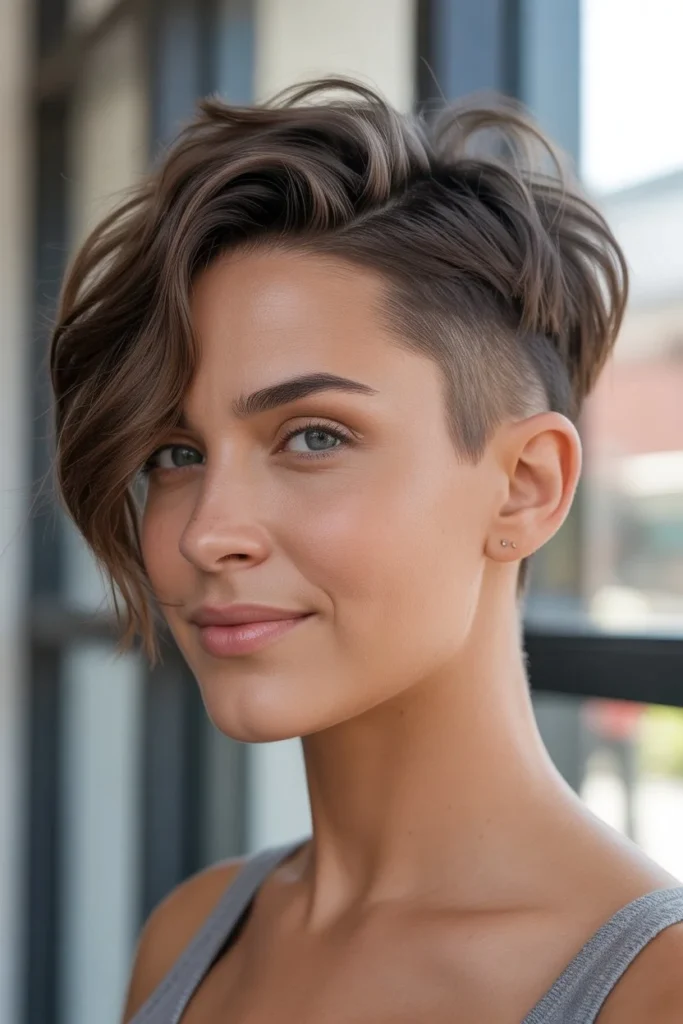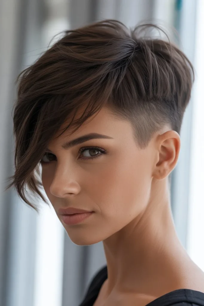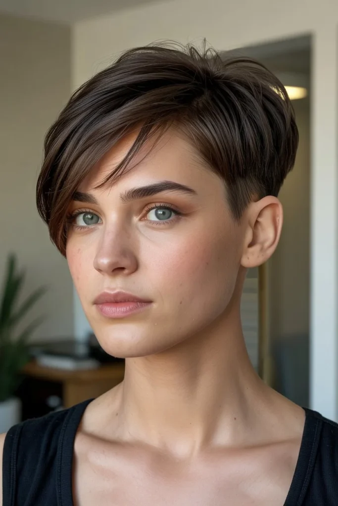 The bold asymmetrical pixie with extreme side part pushes the boundaries of dramatic short hair styling. This striking interpretation features a deep, exaggerated side part that creates maximum contrast between the two sides of the head. One side is closely cropped with a precise undercut, while the opposite side features significantly longer layers that sweep dramatically across the face and create beautiful movement and flow. The rich brown tones with subtle dimension add depth without competing with the structural drama of the cut itself. The piece-y, textured styling adds an edgy, contemporary quality that emphasizes the boldness of this look.