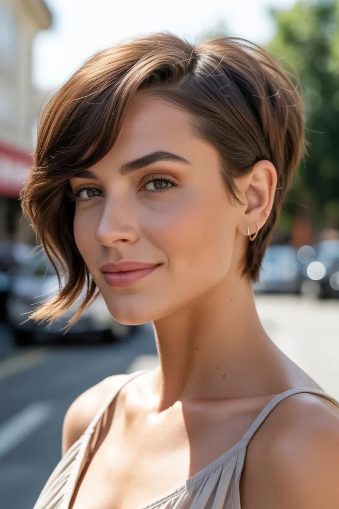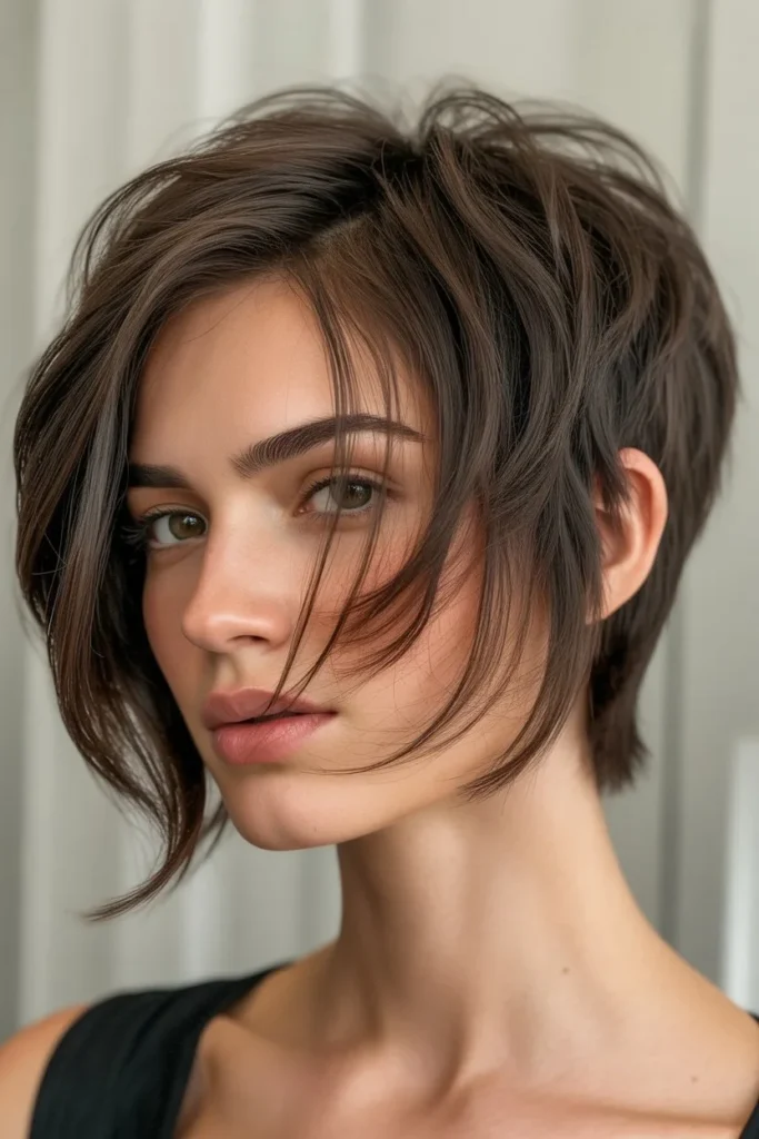 The modern asymmetrical pixie with textured finish represents contemporary cool and effortless style. This fresh interpretation features choppy, piece-y layers throughout that create dimension and movement, while the asymmetrical lines add visual interest and edge. The rich chocolate brown base with subtle dimensional toning creates depth without appearing overly highlighted or artificial. The intentionally messy, textured styling gives this haircut a young, energetic quality that’s perfect for creative professionals, artists, and anyone who embraces a more relaxed, unconventional aesthetic.