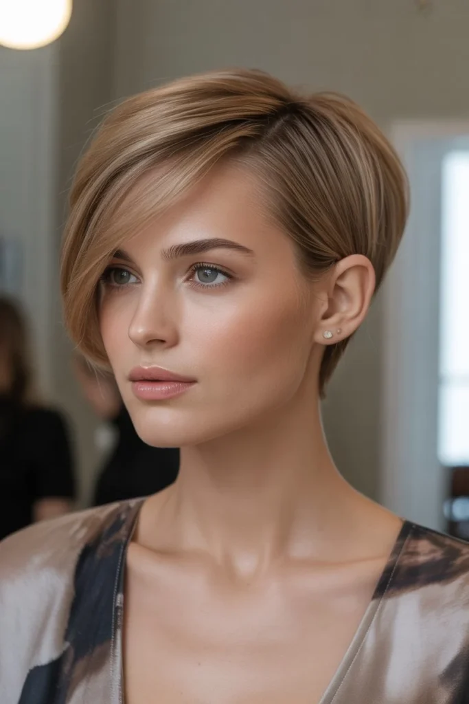 The elegant asymmetrical pixie with smooth finish embodies timeless sophistication and refined style. This polished interpretation features clean, precise lines and a ultra-smooth finish that showcases the architectural quality of the cut. The honey blonde tones with subtle darker lowlights create natural-looking dimension that adds warmth without appearing overly highlighted. The longer front section sweeps gracefully to one side, creating a beautiful diagonal line that flatters the face and draws attention to the eyes, while the shorter back maintains the modern, contemporary aesthetic.