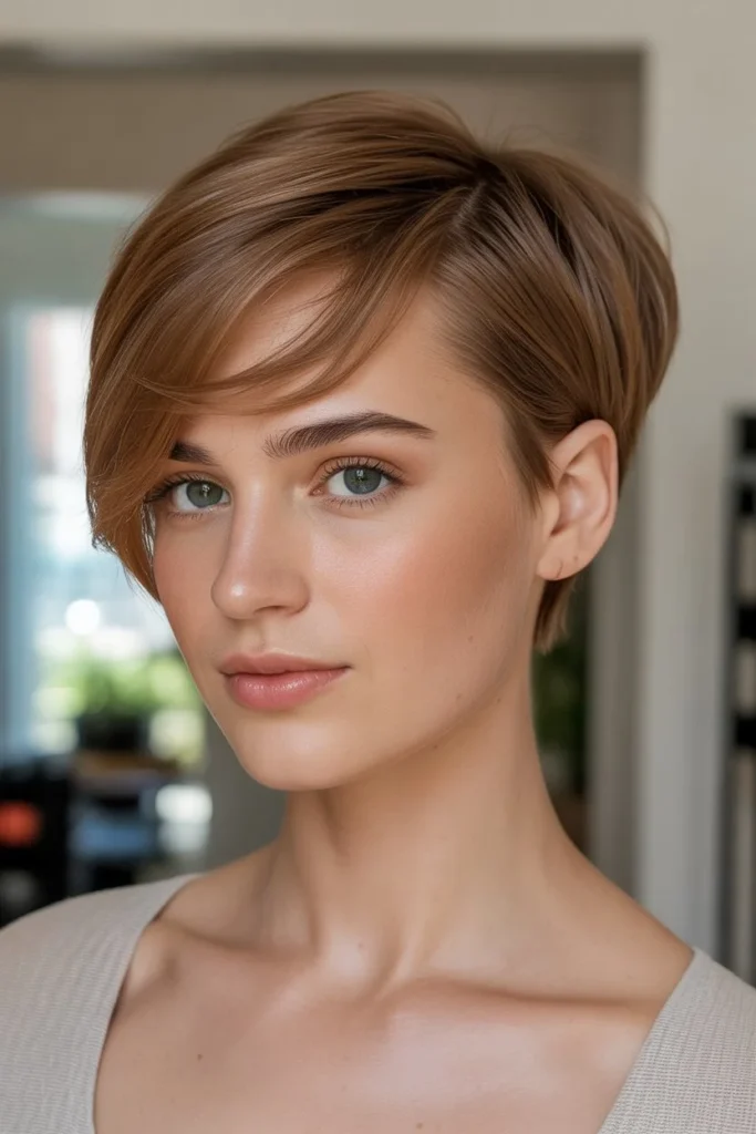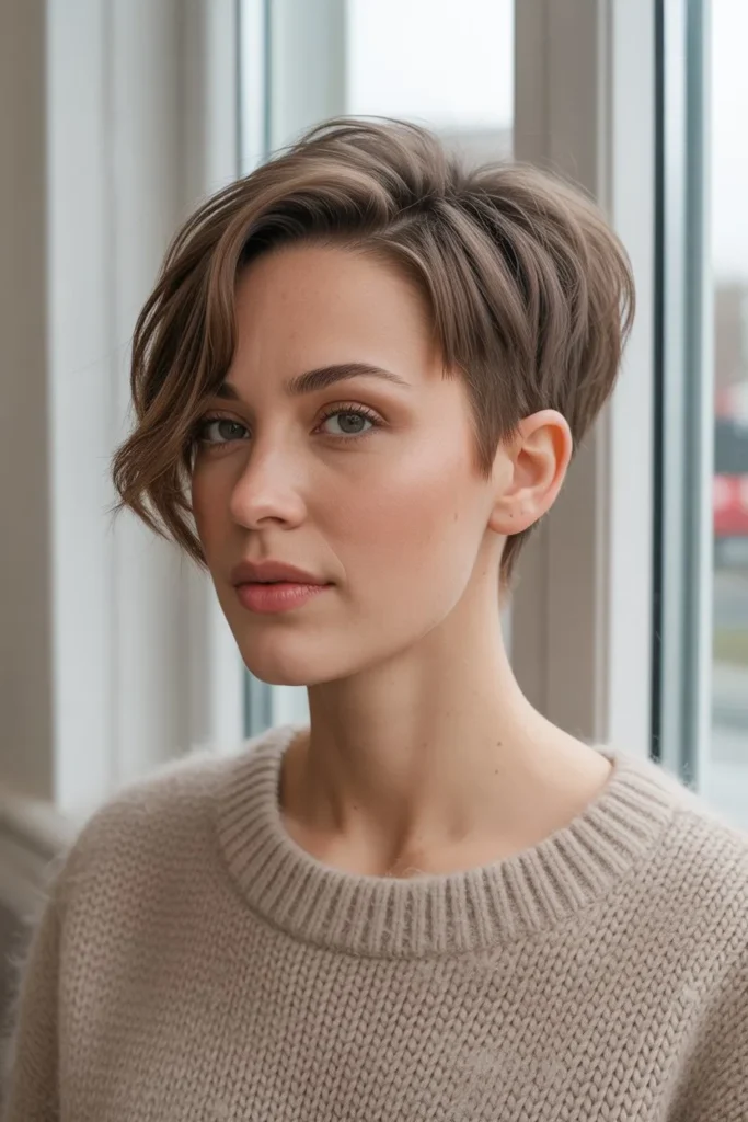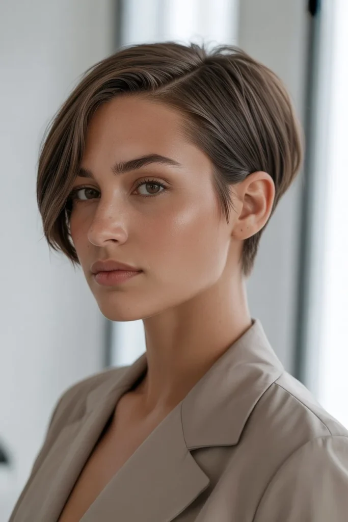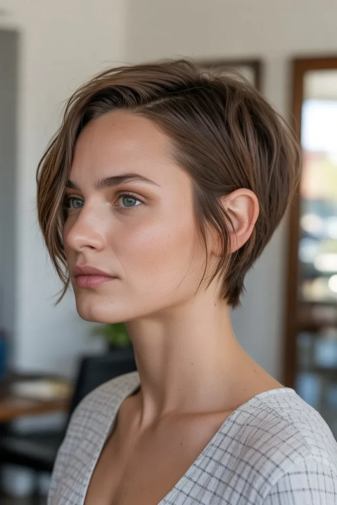This versatile cut flatters virtually all face shapes, particularly those with softer features who want a short style that doesn’t appear too severe or masculine. The layering creates natural volume at the crown while the sides sit close to the head, creating a beautiful silhouette that’s both elegant and contemporary. The neutral background and minimal styling in this image showcase the haircut’s natural beauty and demonstrate how it looks when simply air-dried or lightly blow-dried without extensive styling products or techniques. This makes it an ideal choice for those with naturally straight or slightly wavy hair who prefer low-maintenance styling routines.
