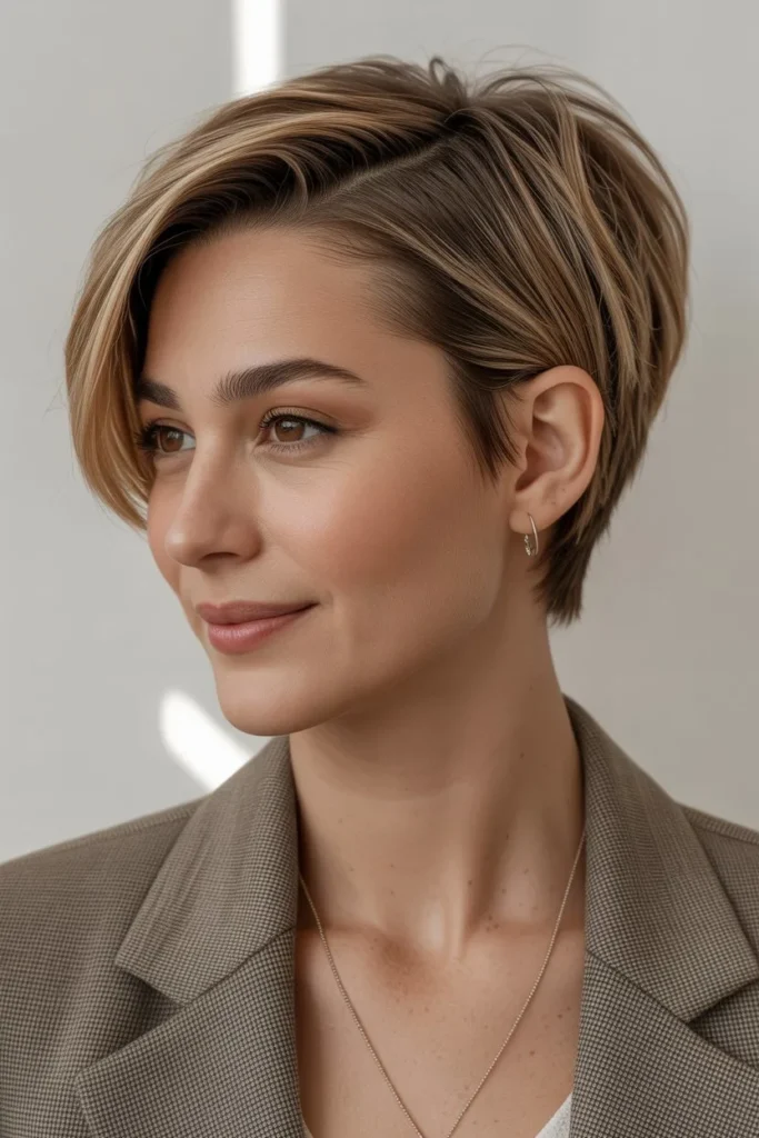The sophisticated asymmetrical pixie with side detail offers a refined, polished approach to short hair that’s perfect for professional environments and formal occasions. This elegant interpretation features a smooth, sleek finish with precisely cut layers that create a beautiful silhouette from every angle. The honey blonde tones with subtle darker roots create a natural, low-maintenance color that adds warmth without requiring constant touch-ups. The side-swept styling emphasizes the asymmetry while creating beautiful face-framing that draws attention to the eyes and enhances the overall bone structure.
