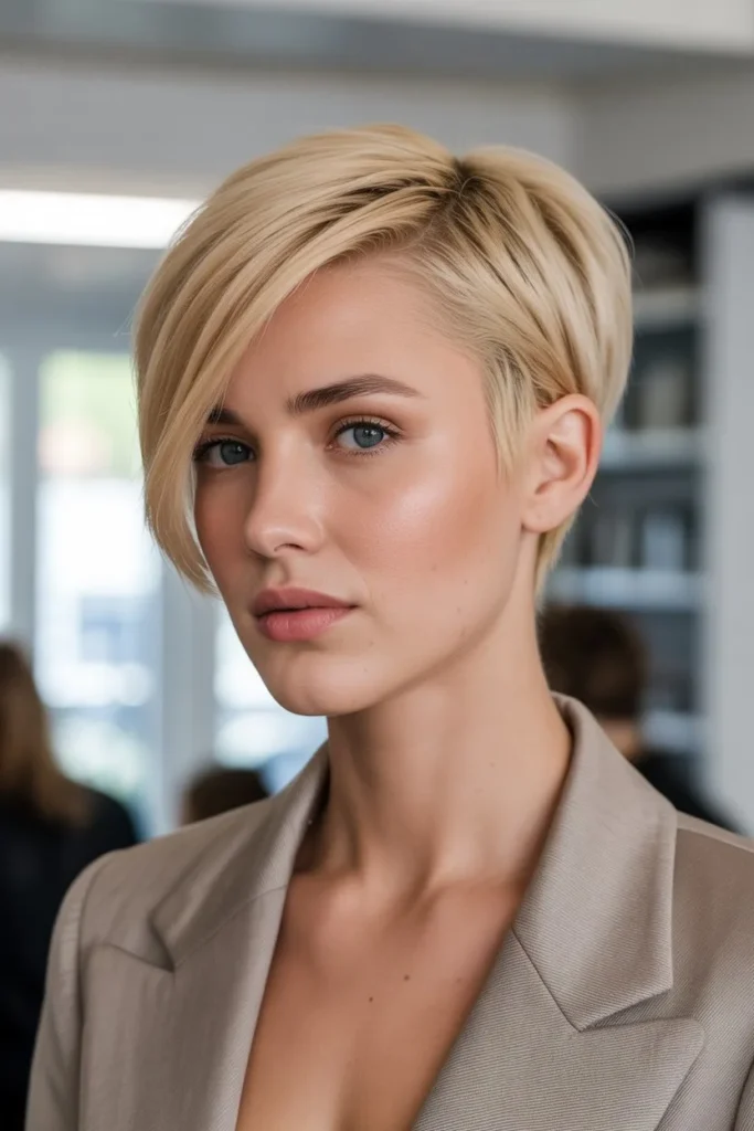 This dramatic style is perfect for those with cool skin tones, as the platinum blonde complements pink, blue, and neutral undertones beautifully. The stark color also highlights the precision of the cut, making every angle and line clearly visible and intentional. This haircut works particularly well for those with fine to medium hair textures, as the strategic layering creates the illusion of fullness and body without requiring excessive volume products. The professional styling shown here, complete with a sophisticated neutral blazer, demonstrates how this bold haircut can absolutely work in business settings when paired with polished, professional styling and classic wardrobe choices.