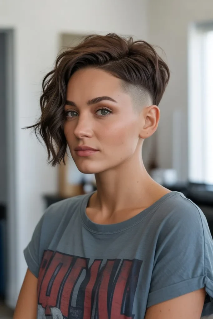 This fearless style is ideal for confident women who want to make a powerful statement with their hair. The dramatic side sweep creates an eye-catching silhouette from every angle, while the undercut adds an element of surprise and edge. The casual interior setting and comfortable styling shown here demonstrate how this bold haircut works in everyday environments, proving that dramatic doesn’t necessarily mean impractical or difficult to incorporate into daily life. The graphic t-shirt pairing emphasizes the style’s contemporary, urban appeal and its natural compatibility with casual, creative fashion choices.
