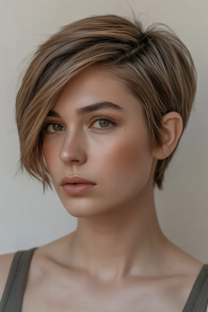 The classic asymmetrical pixie with subtle graduation offers a more understated approach to this trending style, perfect for those who want to embrace the asymmetrical aesthetic without going too dramatic. This refined version features a gentle length variation from one side to the other, creating visual interest while maintaining a professional, polished appearance. The honey-blonde tones with soft brown lowlights add warmth and dimension, while the smooth styling showcases the precise cutting technique required to achieve this sophisticated look.