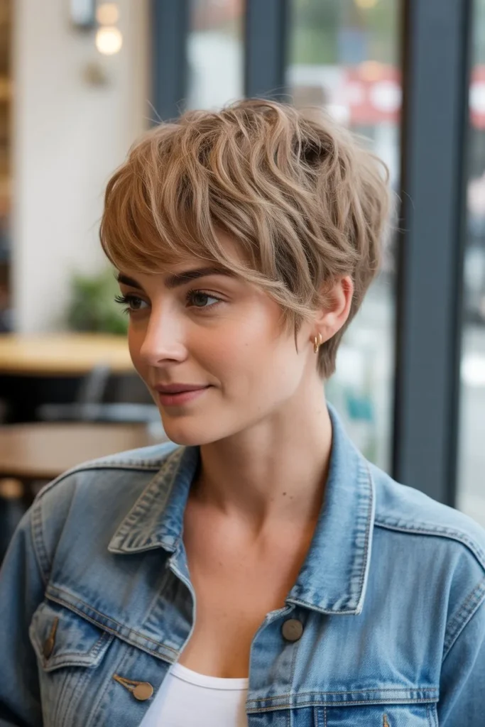 This style is perfect for those who love short hair but want to maintain a romantic, feminine aesthetic. The flowing movement and soft waves create a dreamy quality that beautifully balances the edginess of the asymmetrical cut. The soft natural lighting in this image showcases how the texture and movement work together, creating a multidimensional effect that’s both sophisticated and approachable. This makes it an excellent choice for those with naturally wavy or slightly curly hair who want to embrace their texture while maintaining a modern, fashion-forward short cut that doesn’t appear too severe or masculine.