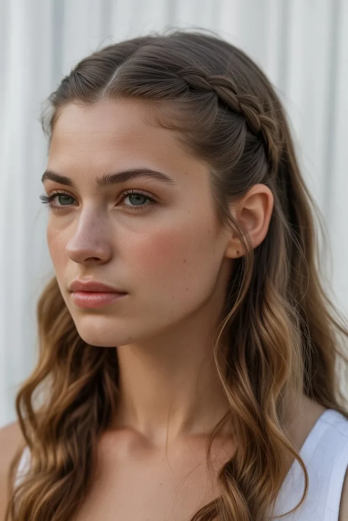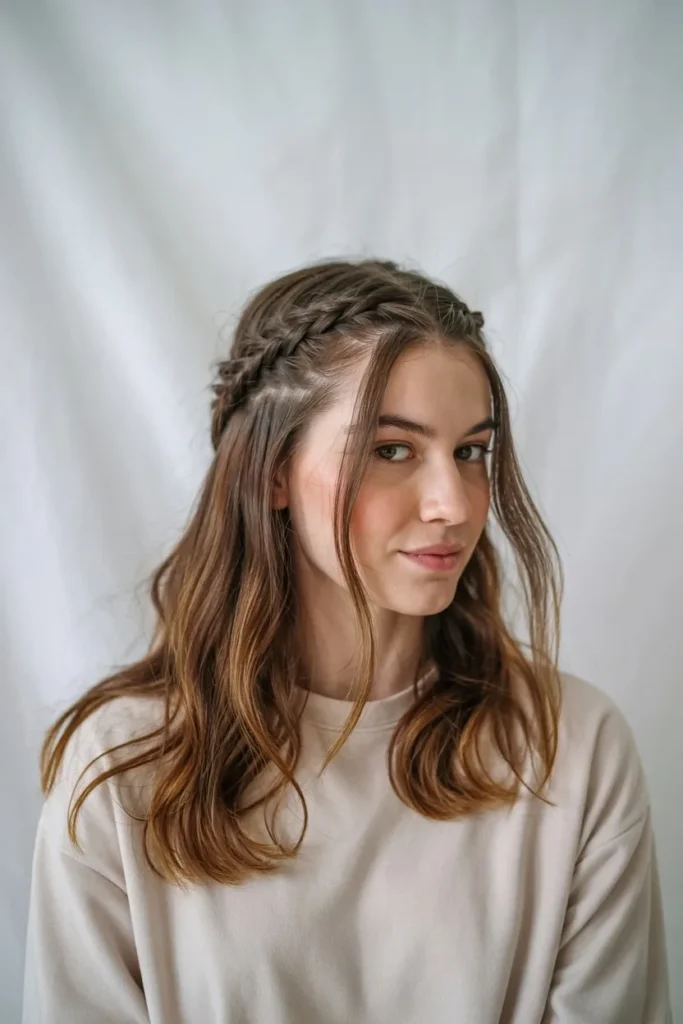 The crown braid works wonderfully for various hair types and lengths, though it’s particularly stunning on medium to long hair where the braid has more visual impact. For added dimension and a softer, more romantic appearance, gently pull on the edges of the braid to loosen it slightly, creating a fuller, more voluminous effect. This technique, called “pancaking,” transforms a tight, neat braid into something more textured and deliberately undone. Face-framing pieces left loose around the temples soften the overall look and prevent it from appearing too severe or costume-like. The crown braid is also an excellent option for second-day hair when your locks could use some refreshing but don’t necessarily need a complete wash and restyle.