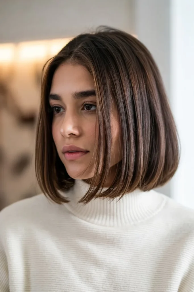 The sleek middle-part bob works particularly well for specific hair types and face shapes, with straight or slightly wavy hair being easiest to achieve this look on, though those with curlier textures can certainly embrace this style with appropriate straightening techniques. The middle part creates a sense of symmetry that’s particularly flattering for oval and heart-shaped faces, though it can be adapted with a slight side part if a center part doesn’t complement your features. This hairstyle projects a sense of modern sophistication and intentional style that works beautifully in creative professional fields, urban environments, or any context where a clean, contemporary aesthetic is valued. The bob length itself offers practical benefits—it’s substantial enough to feel like a proper hairstyle while being short enough to dry quickly and require minimal daily maintenance beyond the initial styling investment.