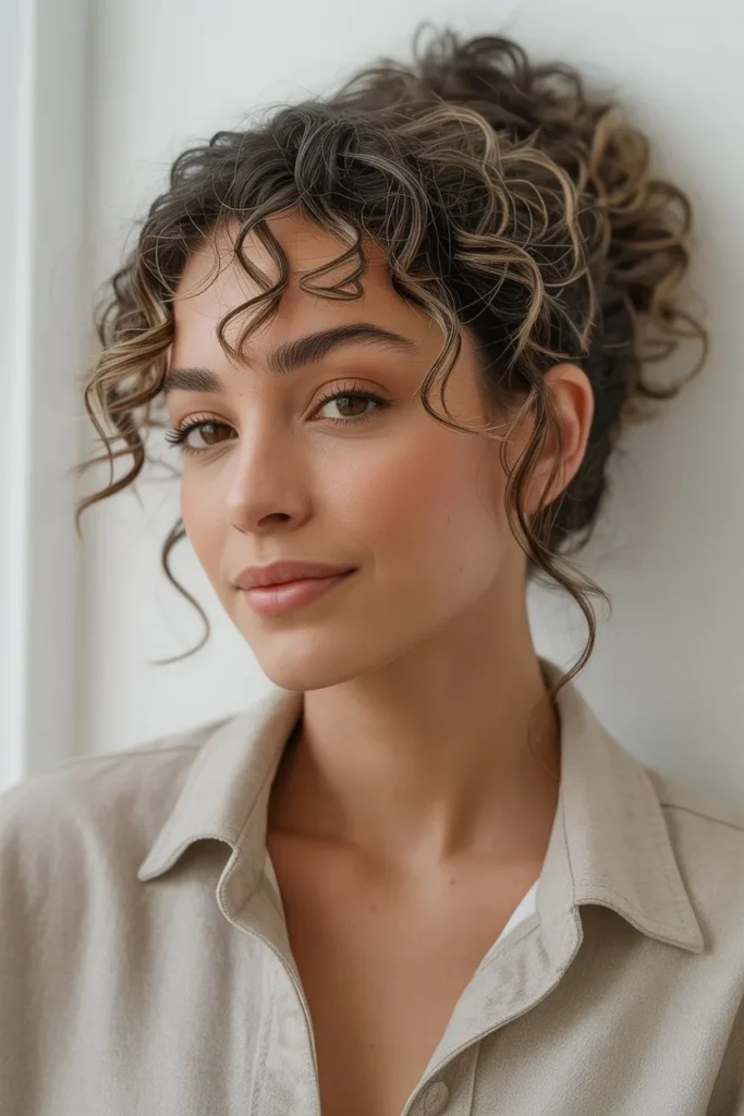 This hairstyle showcases the unique beauty of curly and textured hair types, creating a look that feels both intentional and organic. Leaving some curls loose around the face softens the overall appearance and prevents the style from looking too severe or controlled. You can customize this updo by positioning it higher on the head for a more dramatic, voluminous look, or keeping it lower and more relaxed for everyday wear. The textured curly updo also offers the practical benefit of keeping hair off your neck and face, making it an excellent choice for warm weather, physical activity, or long days when you need your hairstyle to remain secure and intact. This approach to styling celebrates natural hair texture rather than fighting against it, creating a look that feels authentic, beautiful, and uniquely suited to your individual hair characteristics.