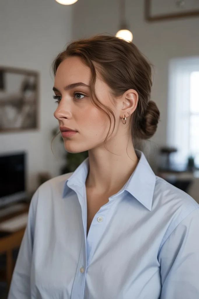 To achieve this polished look, begin by gathering your hair at the nape of your neck, leaving a few face-framing tendrils loose for a softer, more romantic appearance. The key to a modern low bun is embracing a slightly relaxed aesthetic rather than pulling everything too tightly, which can look overly severe and dated. Twist your hair gently before wrapping it into a bun shape, securing it with bobby pins that match your hair color for a seamless finish. A light mist of hairspray will keep everything in place throughout the day without making your hair feel stiff or crunchy.