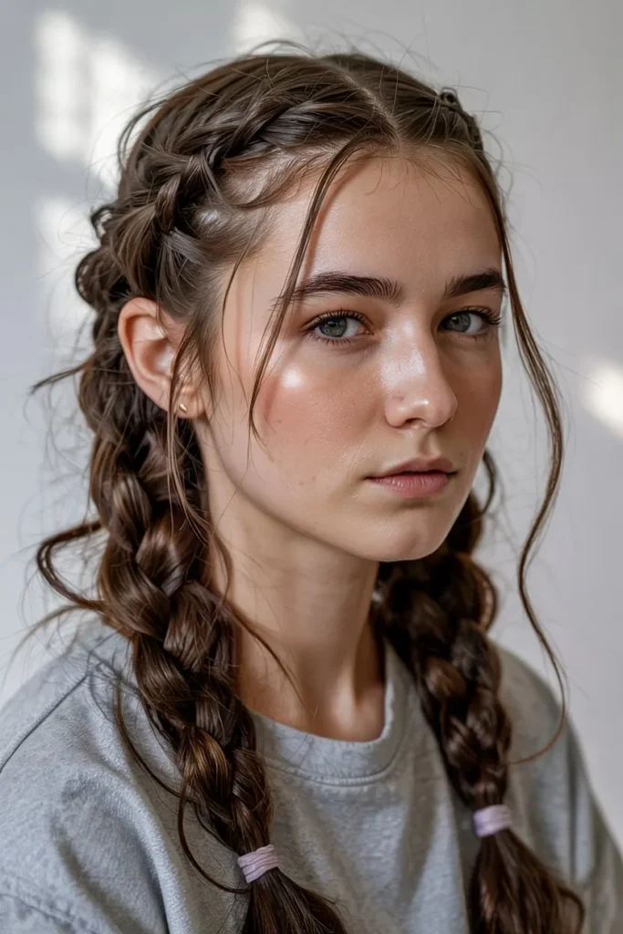 Double braids work exceptionally well for active lifestyles, as they keep hair completely secured and out of your face during physical activities like workouts, hiking, or sports. However, they also translate beautifully to more relaxed, social contexts when styled with care and attention to detail. Adding ribbons, decorative elastics, or wrapping sections of hair around the elastic bands elevates the look from basic to stylish. This hairstyle also offers excellent versatility in terms of positioning—high pigtails create a fun, youthful energy, while lower, behind-the-ears placement feels more mature and refined. Double braids work with various hair lengths, from shoulder-length to very long hair, and they’re particularly effective for showcasing hair color, especially if you have highlights or balayage, as the braiding pattern displays multiple tones and creates beautiful dimension throughout the style.