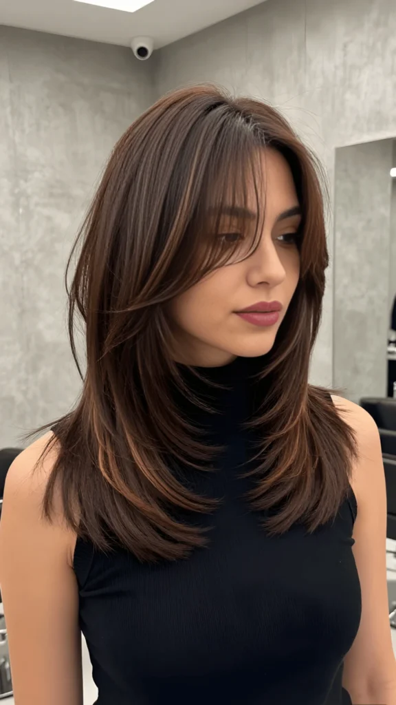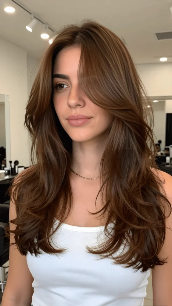 This warm brunette is so rich and dimensional. The base is a deep chocolate brown, and the soft highlights are placed throughout to add light and movement. The layers are long and flowing, giving the hair a really romantic, feminine feel. It’s one of those colors that looks different in every light, and I think that’s what makes it so special. It’s a great option for spring hair color trends 2026 if you want something that feels timeless but still current.