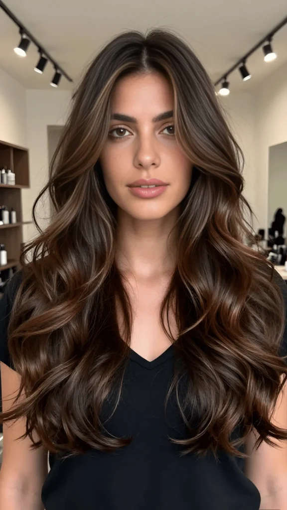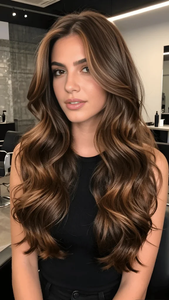 This rich chocolate brown is so luxurious. The color is deep and glossy, with dimensional lowlights that add depth and movement. The waves are soft and voluminous, giving the hair a really polished, elegant finish. It’s one of those colors that feels sophisticated and timeless, and it’s perfect for spring hair color trends 2026 if you want something that looks expensive and well-maintained.