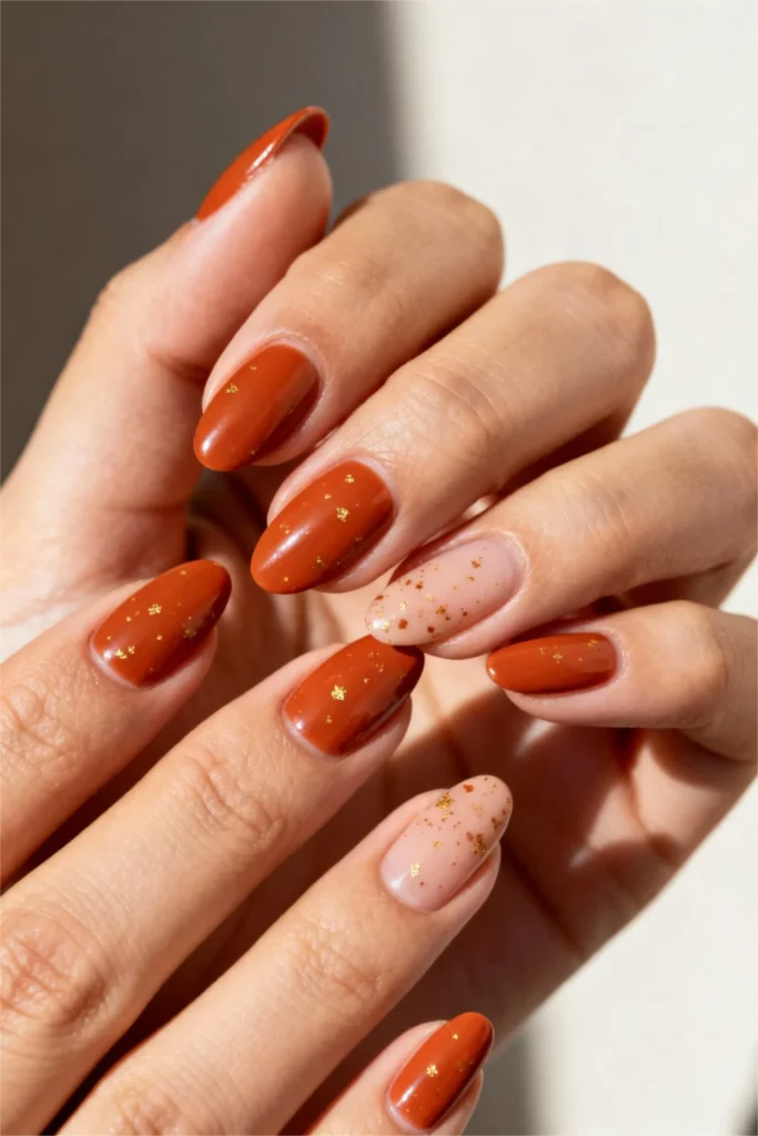 Warm, earthy tones are everywhere right now, and this rust orange is a perfect example. It’s burnt and rich, like autumn leaves or terracotta pottery. Some nails are solid rust, while others feature a softer peachy-nude base with scattered gold foil flakes. The combination is warm, inviting, and has this handmade, artisanal quality that feels really current.