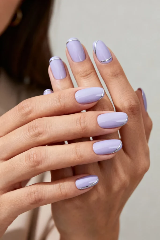 Soft lavender with silver chrome accents is dreamy and modern at the same time. The lavender base is glossy and slightly cool-toned—not too pastel, not too purple, just right. Then the cuticle area of each nail has this thin silver chrome stripe that adds a futuristic, almost sci-fi element to an otherwise soft and romantic color.